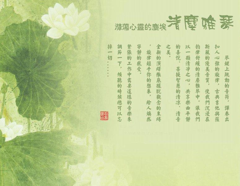 让我们以一颗清净之心共享乐曲平静的喜悦、菩提智慧的清凉、清音之美,沉浸在韵律舒缓的清尘雅琴中。当音乐飘过混乱的心,或飘过安宁的心,所有尘埃被涤荡得干干净净。佛就在身边,佛就在心中,无限的希望和生命如莲花迎风而开。